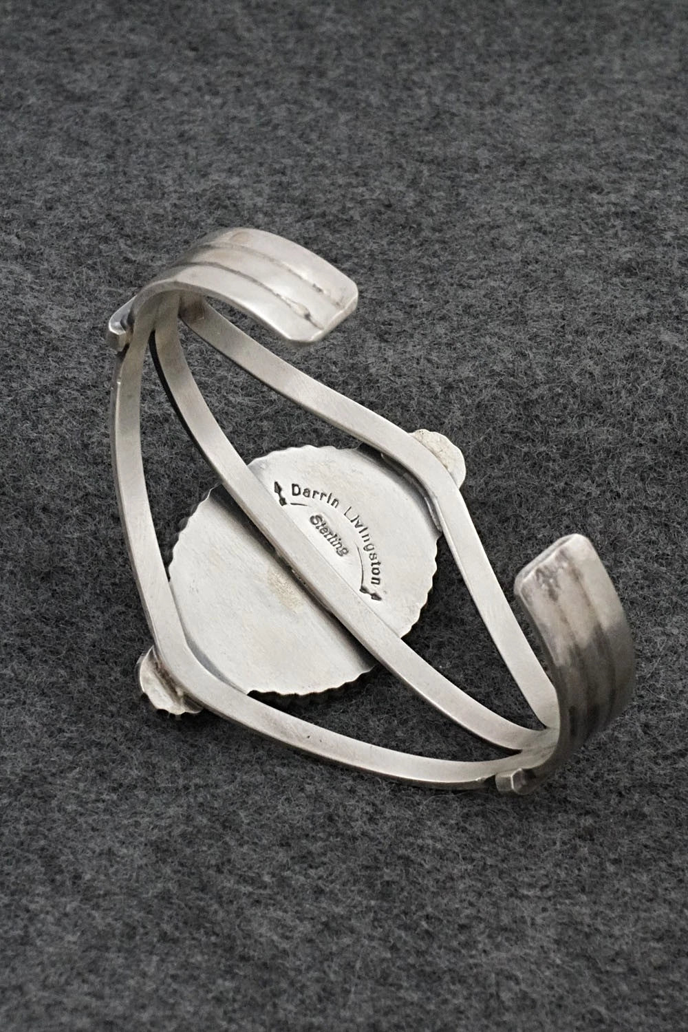 This impressive Kingman turquoise and brushed-finish sterling silver bracelet was made by Navajo silversmith Darrin Livingston. The back is signed and stamped sterling.