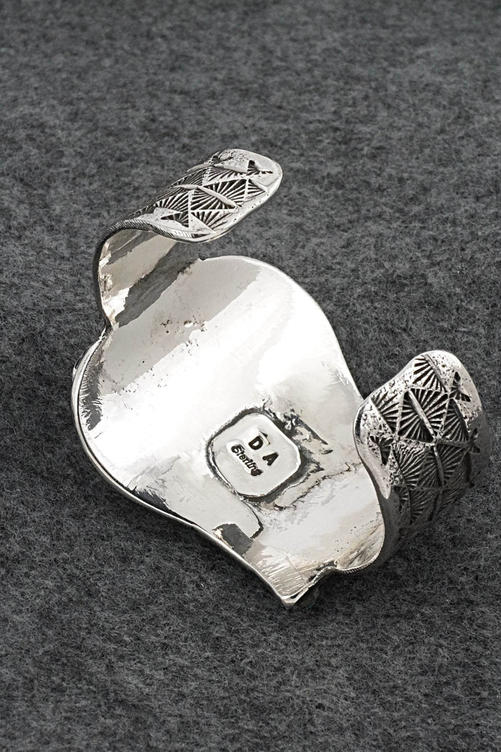 This remarkable turquoise and bright-polish sterling silver bracelet shaped like a guitar belt buckle was made by Navajo silversmith Delbert Arviso. The back is signed DA and sterling.