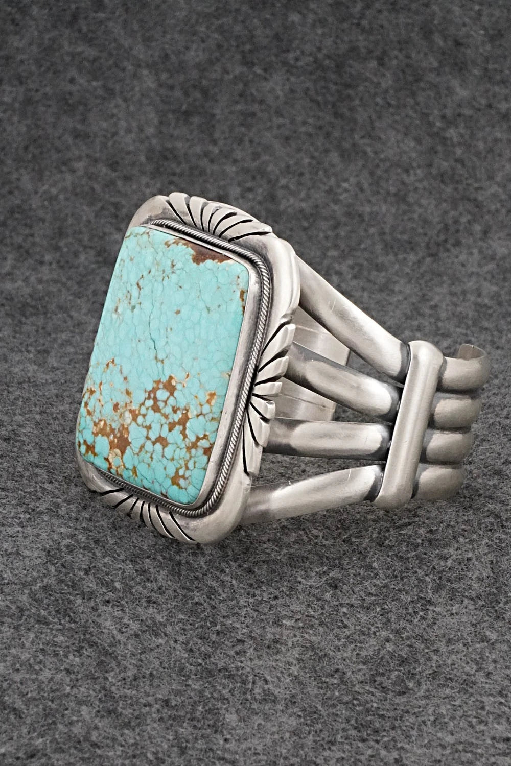 This impressive #8 turquoise and brushed-finish sterling silver bracelet was made by Navajo silversmith Mark Yazzie. The back is signed Mark Yazzie and stamped sterling.
