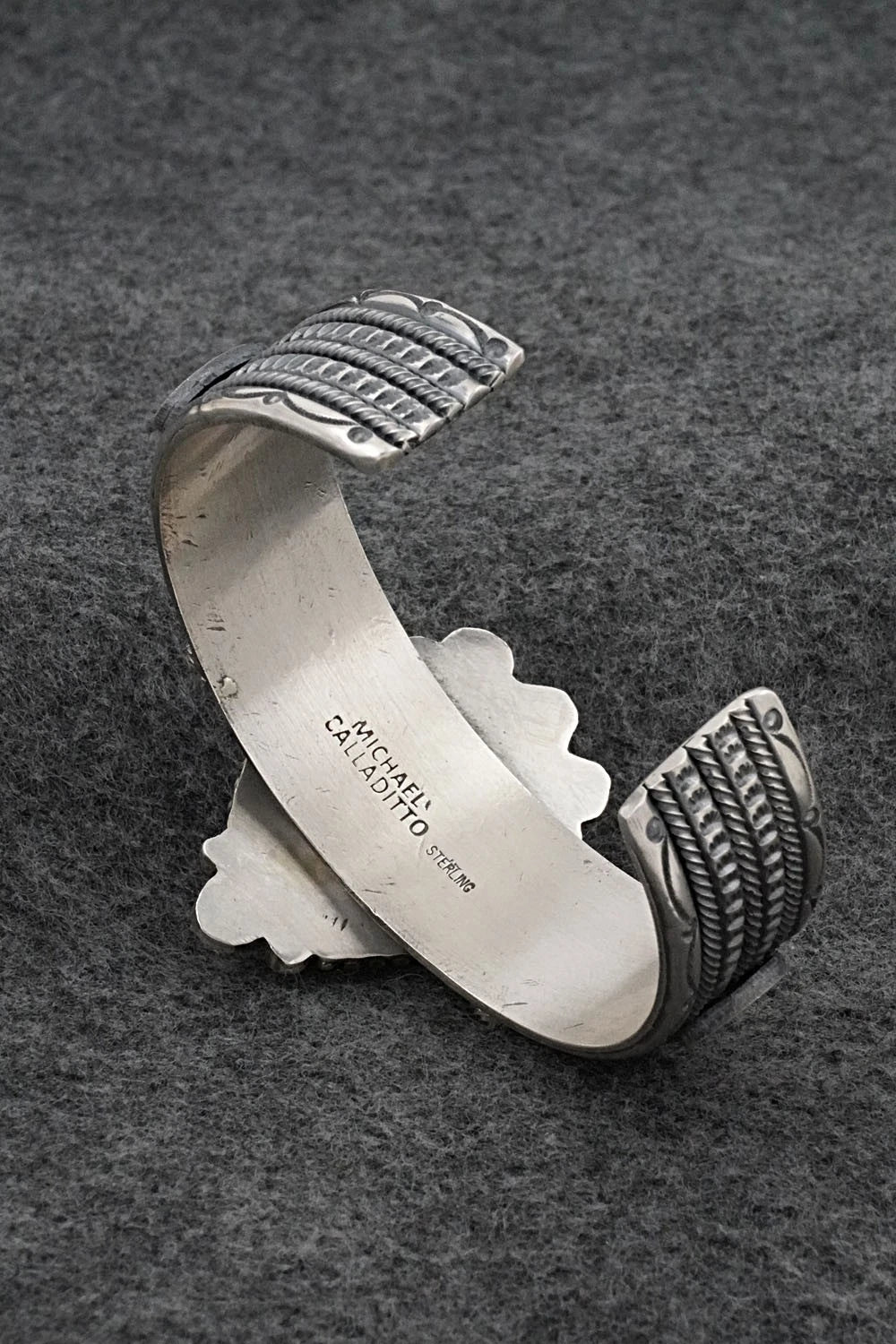 This stunning Kingman turquoise and brushed-finish sterling silver bracelet was made by Navajo silversmith Michael Calladitto. The back is signed Michael Calladitto and stamped Sterling.