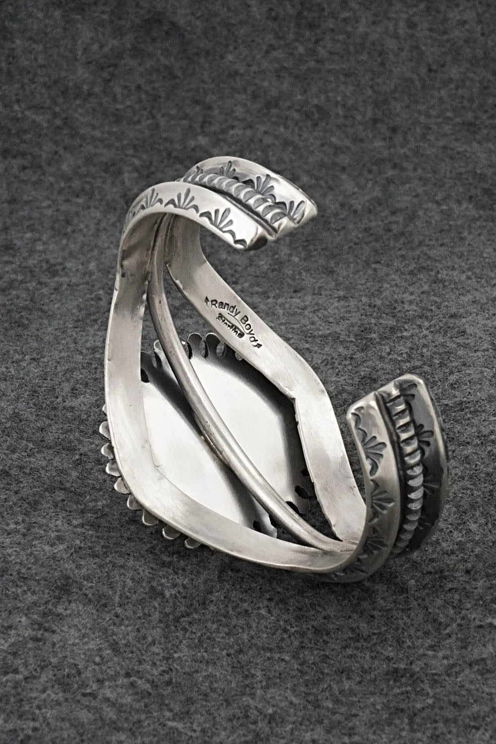 This impressive Kingman turquoise and brushed-finish sterling silver bracelet was made by Navajo silversmith Randy Boyd. The back is signed Randy Boyd and stamped sterling.