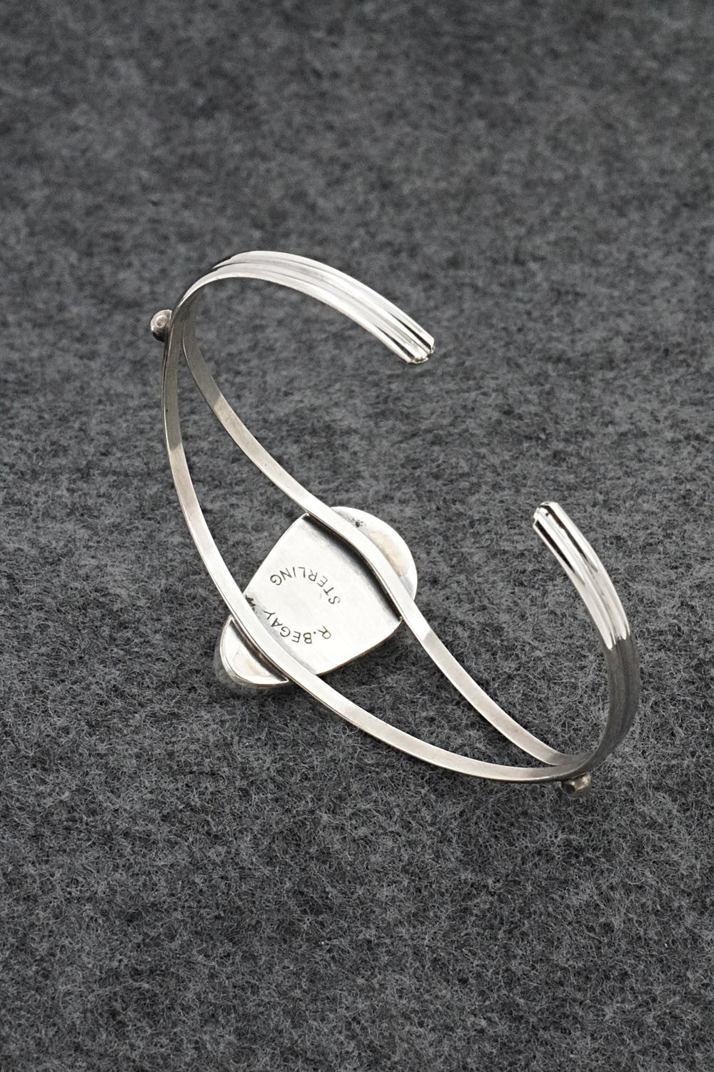 This Egyptian turquoise and bright-polish sterling silver bracelet was made by Navajo silversmith Rena Begay. The back is stamped R. Begay and Sterling.