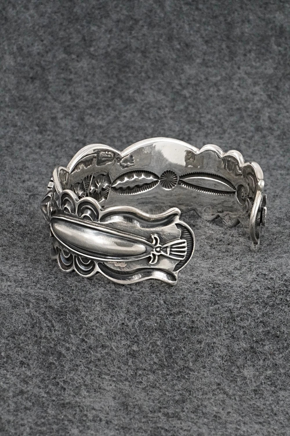 This impressive turquoise and brushed-finish sterling silver bracelet was made by Navajo silversmith Roland Dixson. The back is signed and stamped sterling.