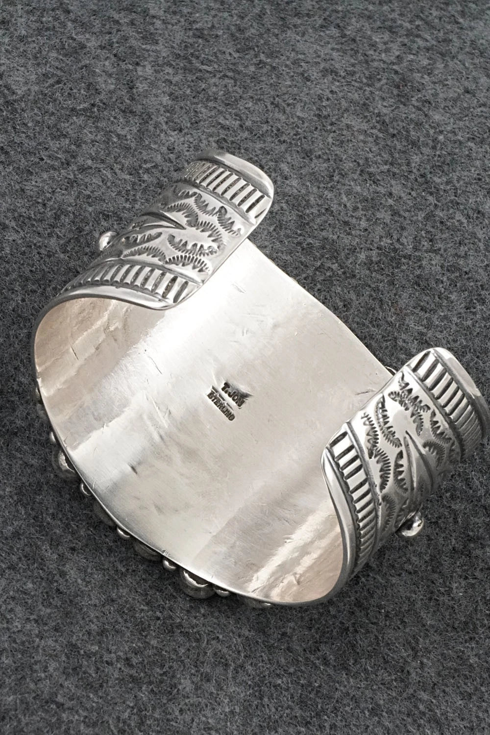 This stunning turquoise and brushed-finish sterling silver bracelet was made by Navajo silversmith Tillie Jon. The back is signed T. Jon and stamped Sterling.