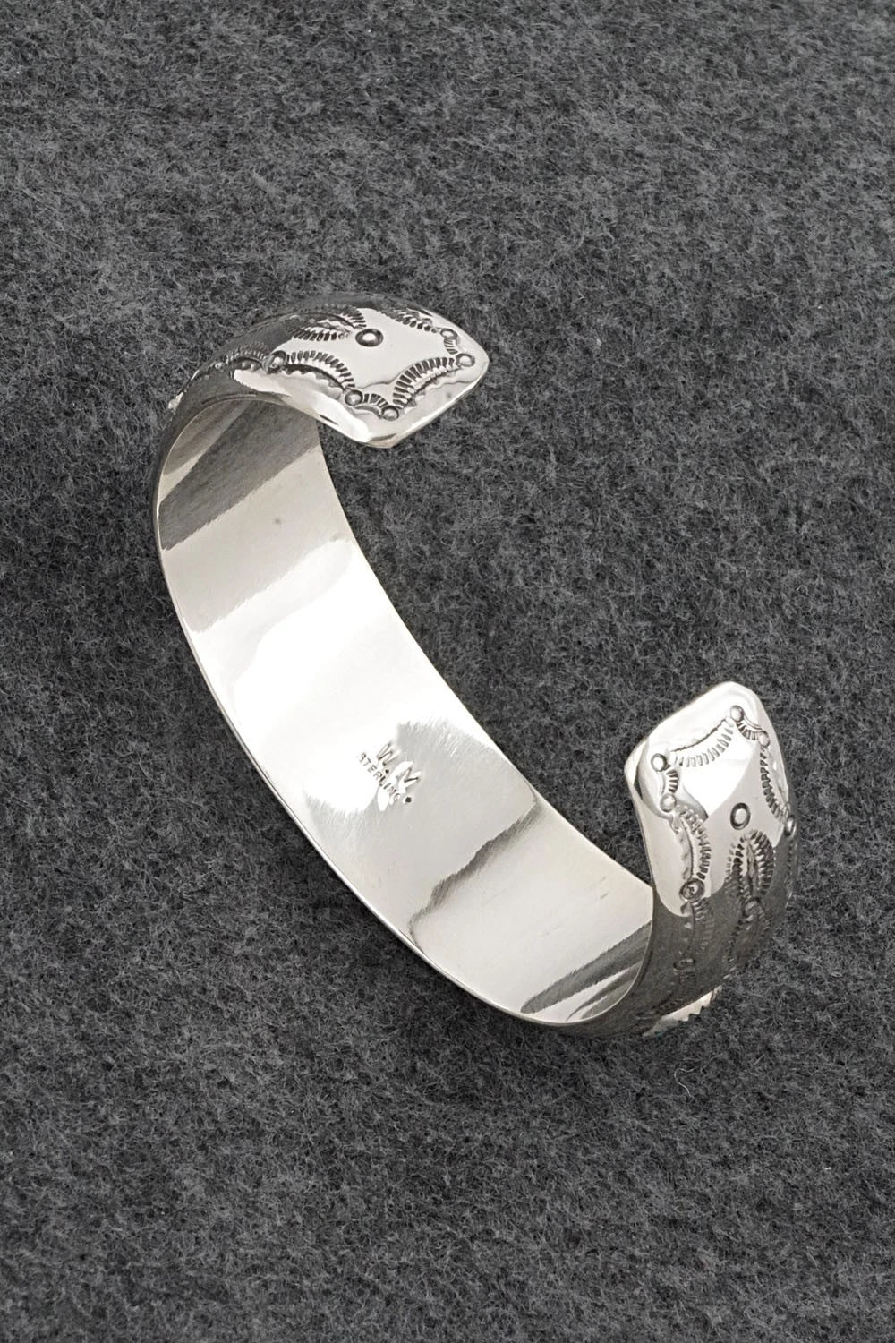 This beautiful turquoise and bright-polish sterling silver bracelet was expertly crafted by Navajo silversmith Wilbert Muskett Sr. The inside of the bracelet is signed W.M. and stamped sterling.