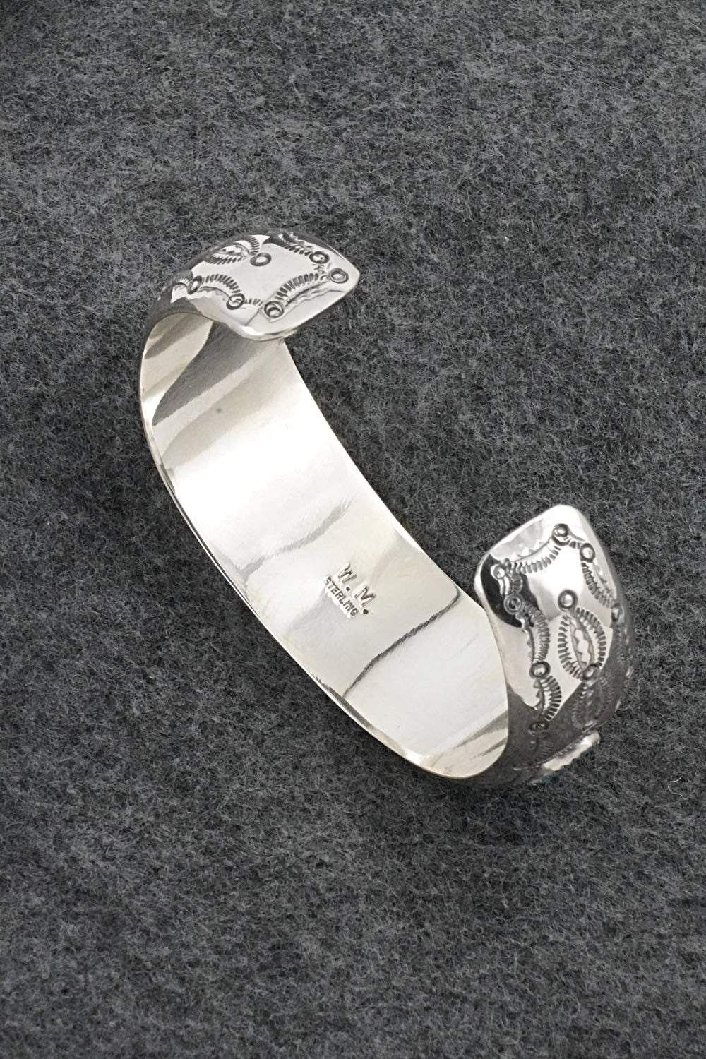 This beautiful turquoise and bright-polish sterling silver bracelet was expertly crafted by Navajo silversmith Wilbert Muskett Sr. The inside of the bracelet is signed W.M. and stamped sterling.