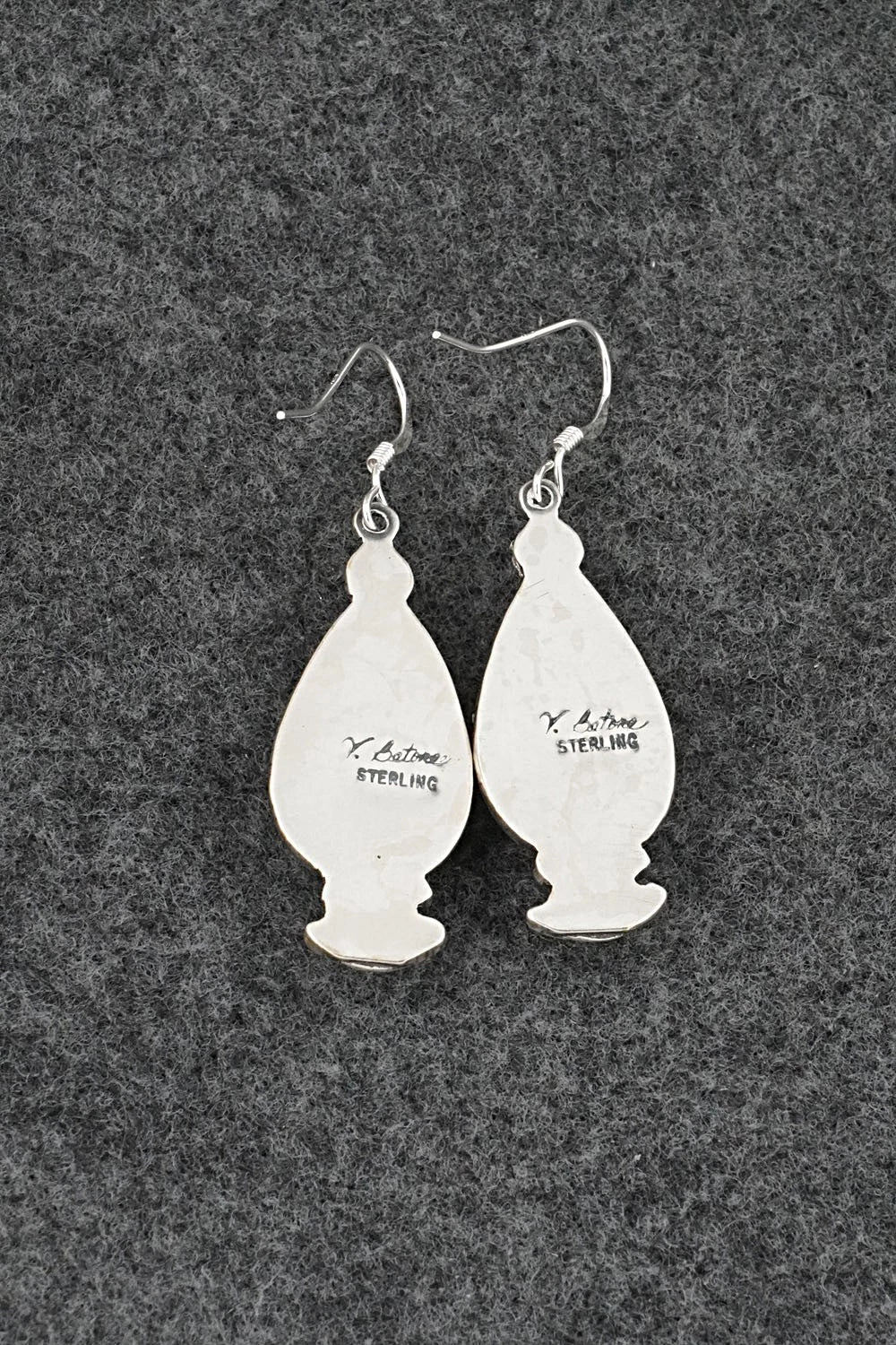 These finely crafted turquoise and brushed-finish sterling silver earrings were made by Navajo silversmith Verley Betone. The backs are signed V. Betone and stamped sterling