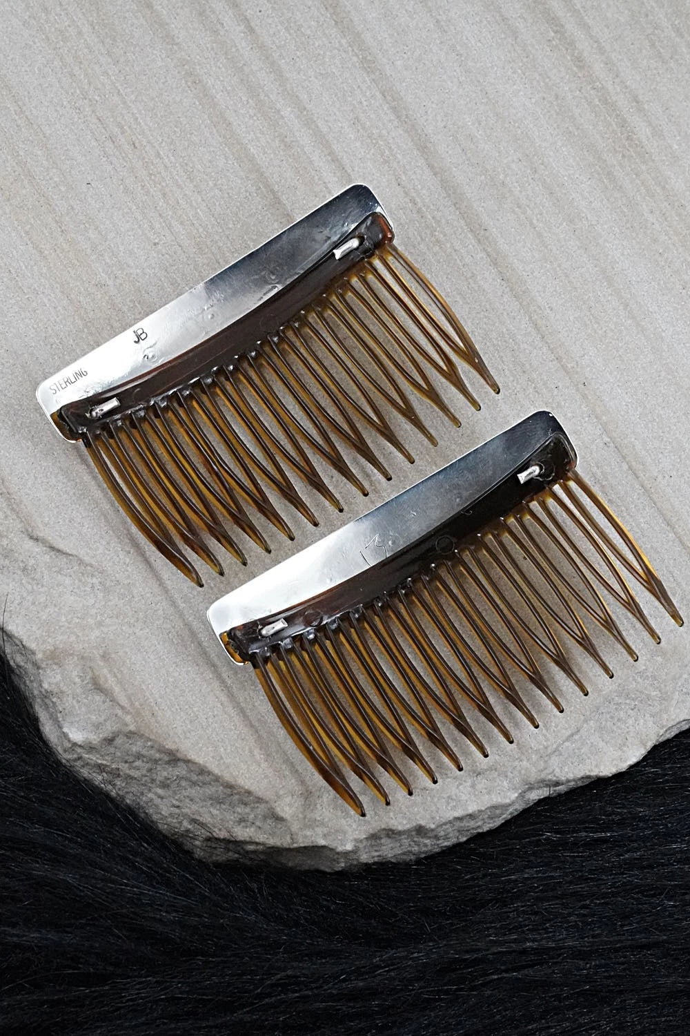 These turquoise and bright-polish sterling silver hair combs were made by Navajo silversmith Jolene Begay. The back is signed JB and stamped sterling.
