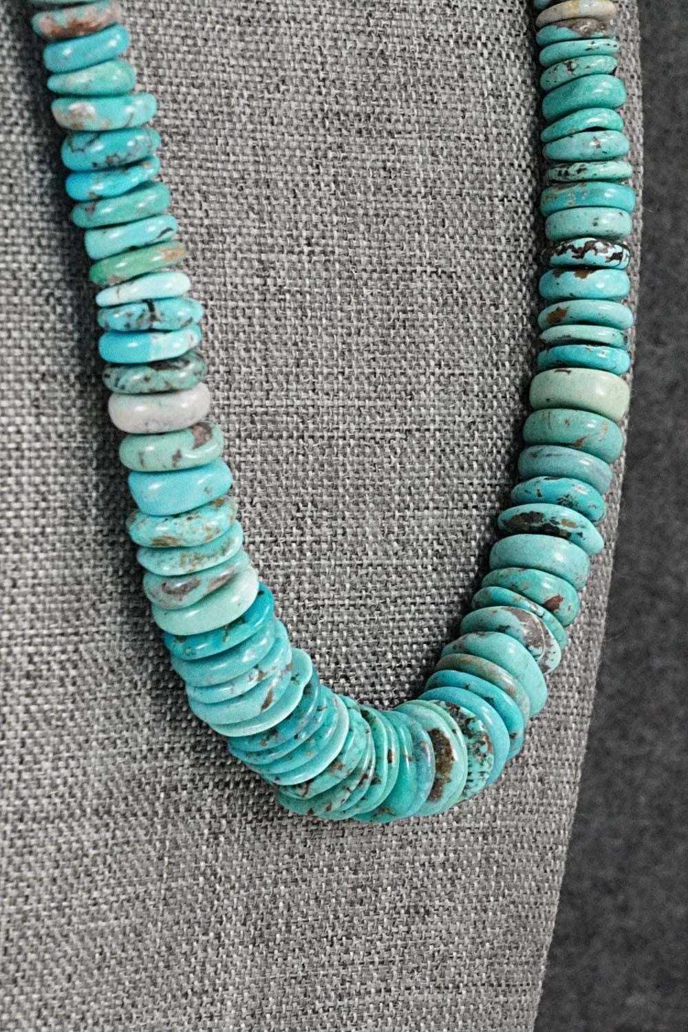 This beaded turquoise and sterling silver necklace was made by Navajo artisan Doreen Jake. The end cones are stamped sterling.