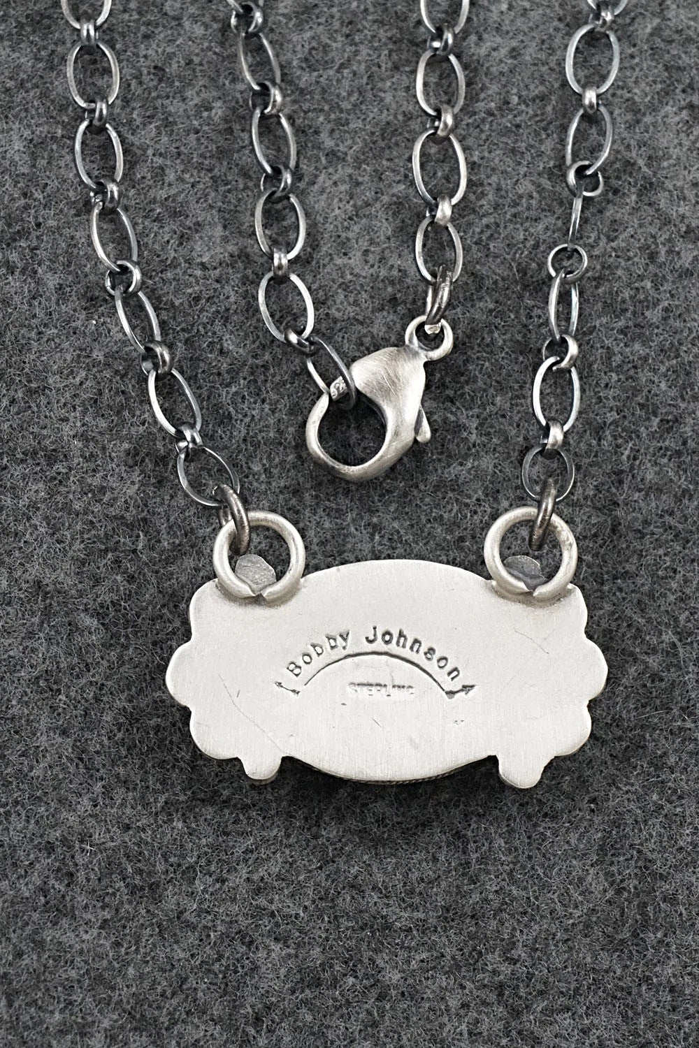 This beautiful Sonoran Rose turquoise and brushed-finish sterling silver necklace was made by Navajo silversmith Bobby Johnson. The back is stamped Bobby Johnson and sterling.
