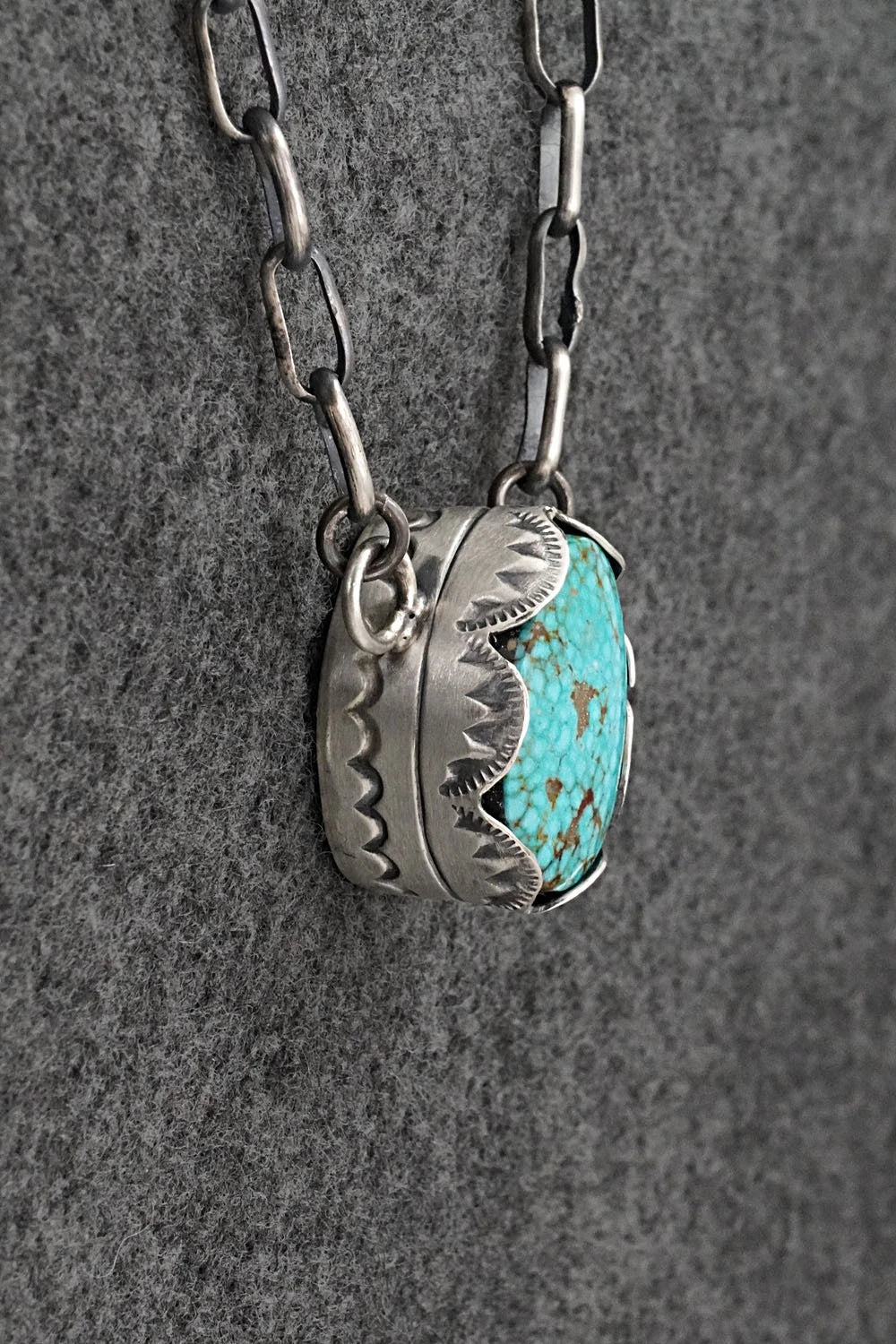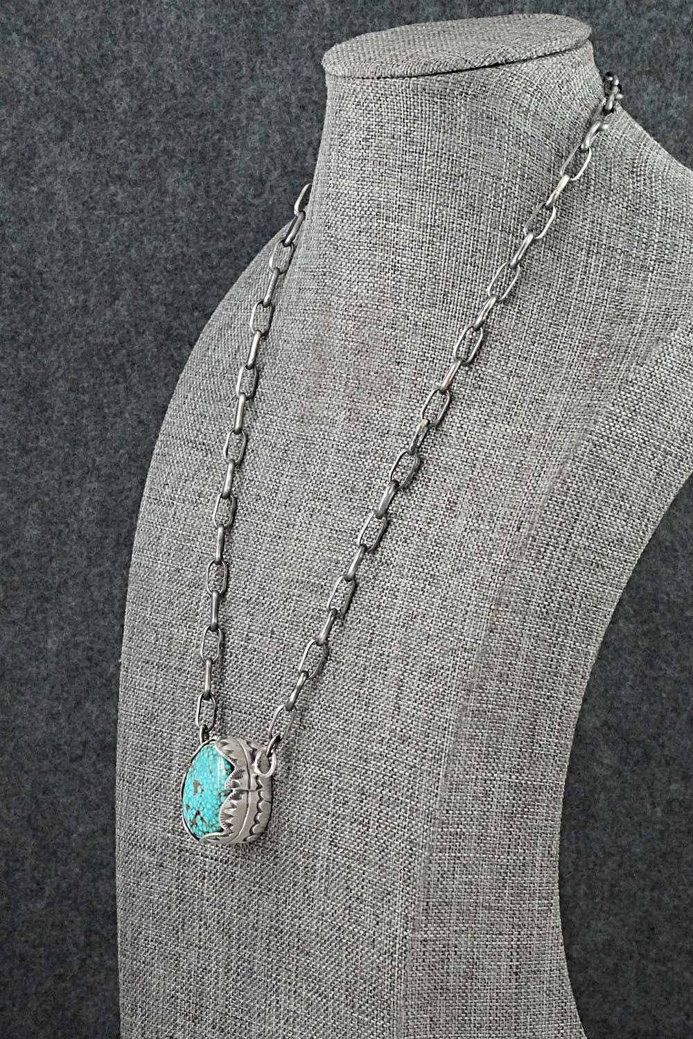 This natural Kingman turquoise and brushed-finish sterling silver necklace was made by Navajo silversmith Paul Livingston. The back is signed Paul Livingston and stamped sterling.