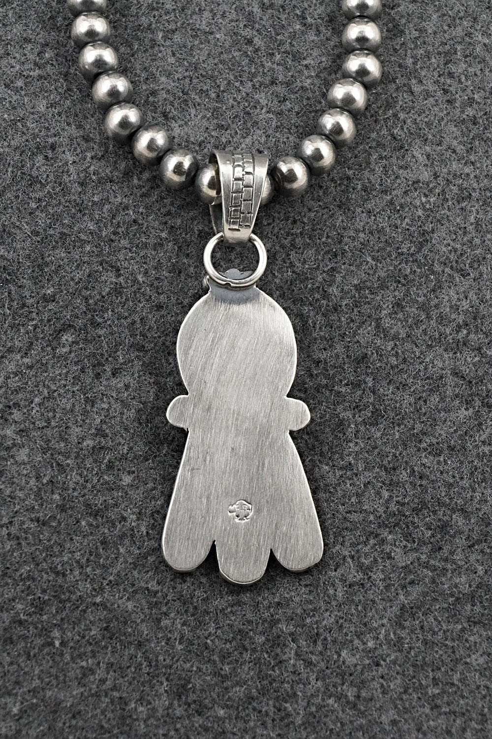 This Kingman turquoise and brushed-finish sterling silver necklace was made by Navajo silversmith Verley Betone. The back is stamped R.B. and .925.