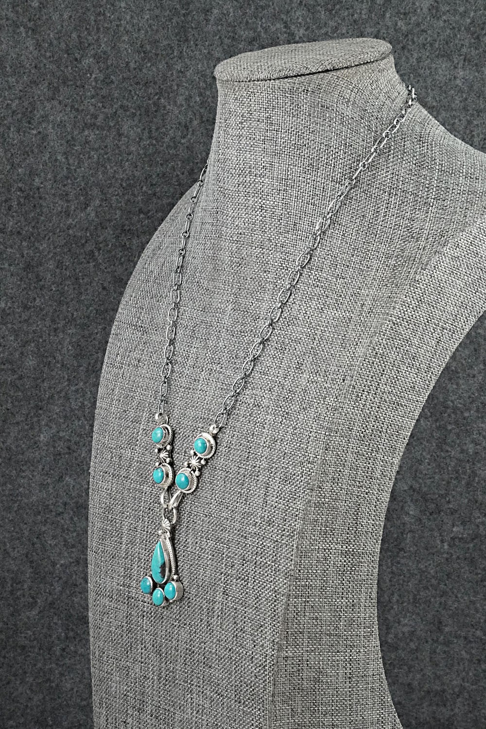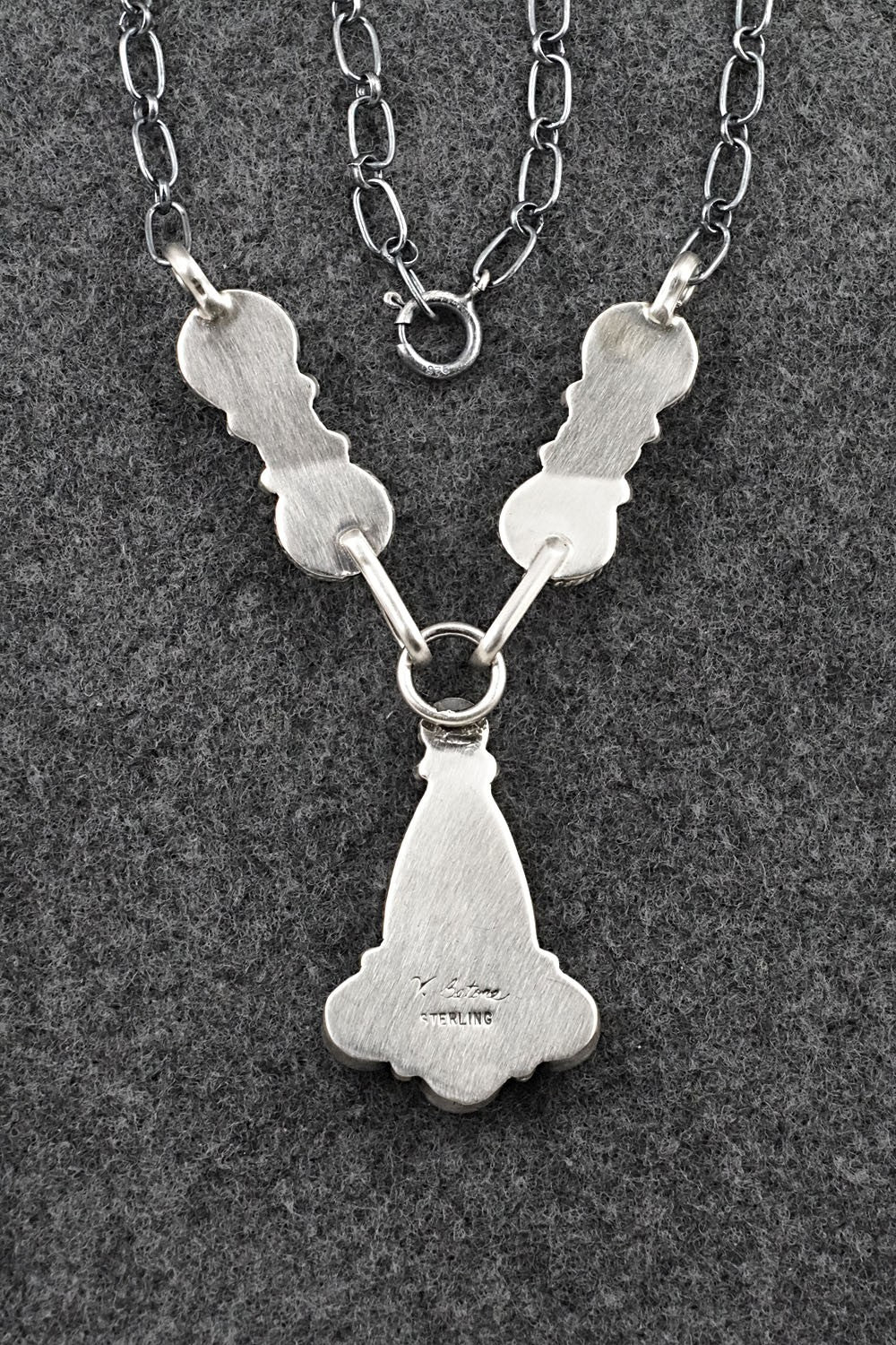 This turquoise and brushed-finish sterling silver necklace was made by Navajo silversmith Verley Betone. The back is signed V. Betone and stamped sterling.