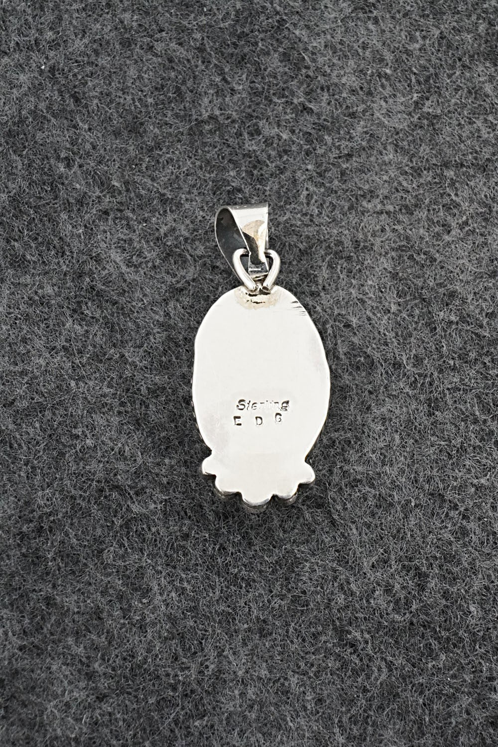 This natural Kingman turquoise and bright-polish sterling silver pendant was made by Navajo silversmith Eugene Gruber. The back is stamped EDG and sterling.