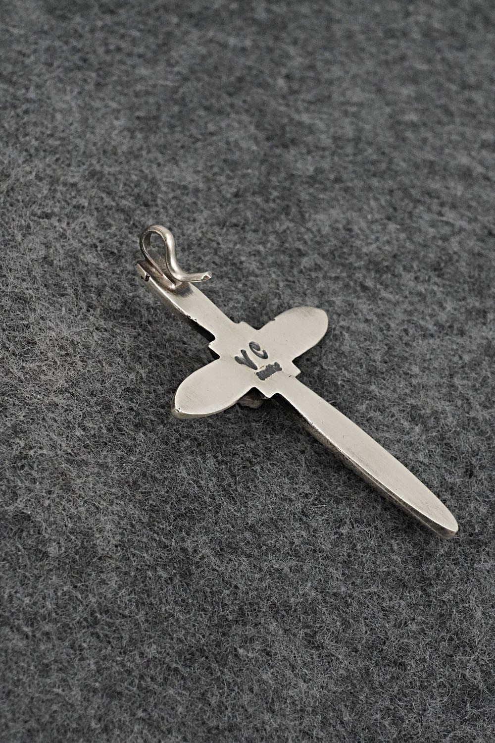 This turquoise and brushed-finish sterling silver cross-shaped pendant was made by Navajo silversmith Valerie Cayatiento. The back is signed VC and stamped sterling.