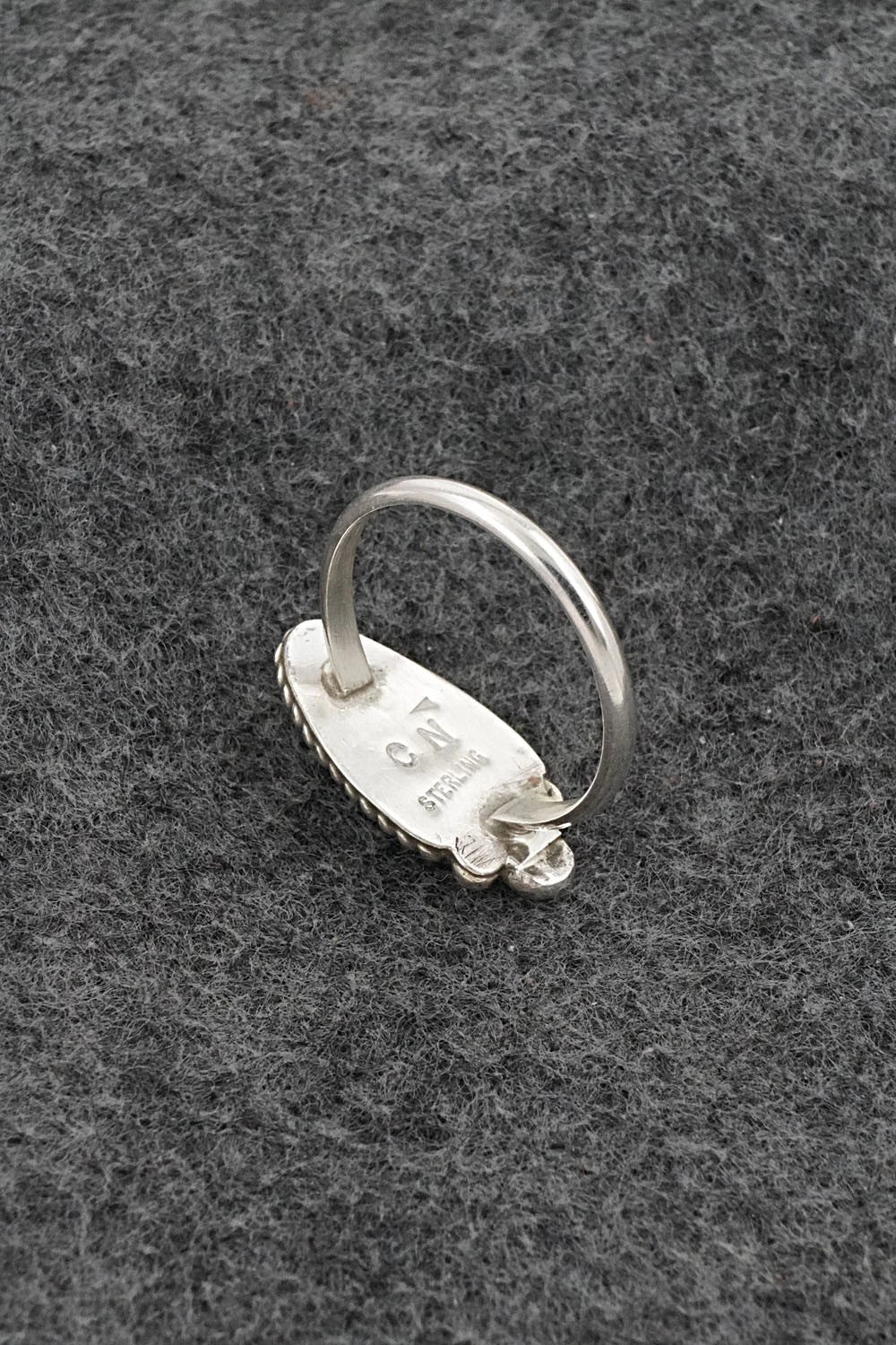 This beautiful turquoise and bright-polish sterling silver ring was made by Navajo silversmith Cody Nez. The back is signed CN and stamped sterling.