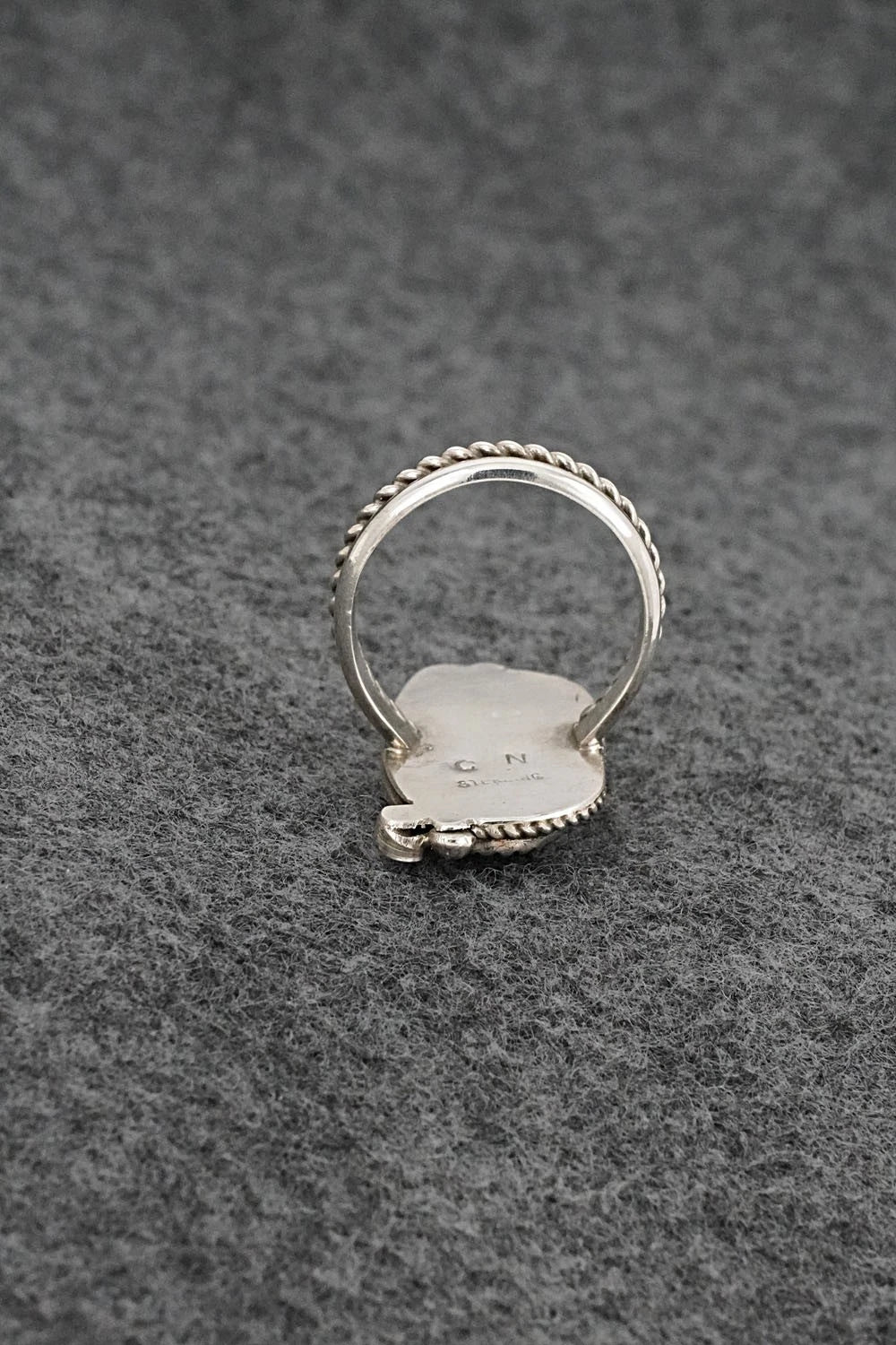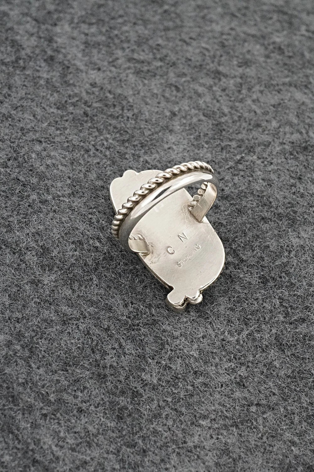 This beautiful turquoise and bright-polish sterling silver ring was made by Navajo silversmith Cody Nez. The back is signed CN and stamped sterling.