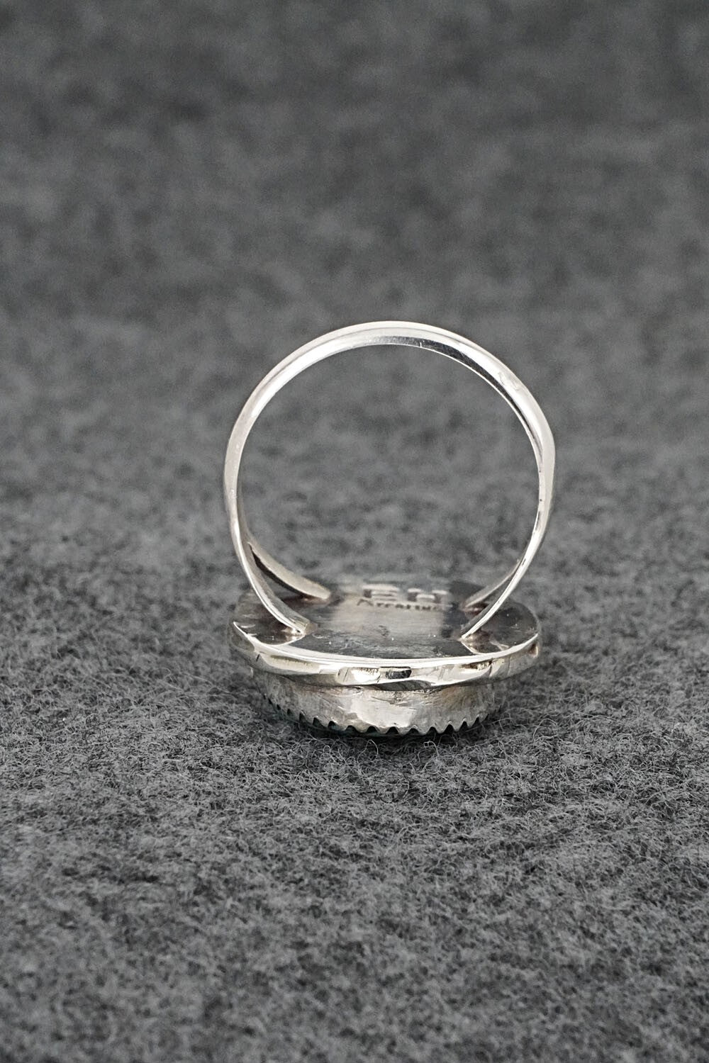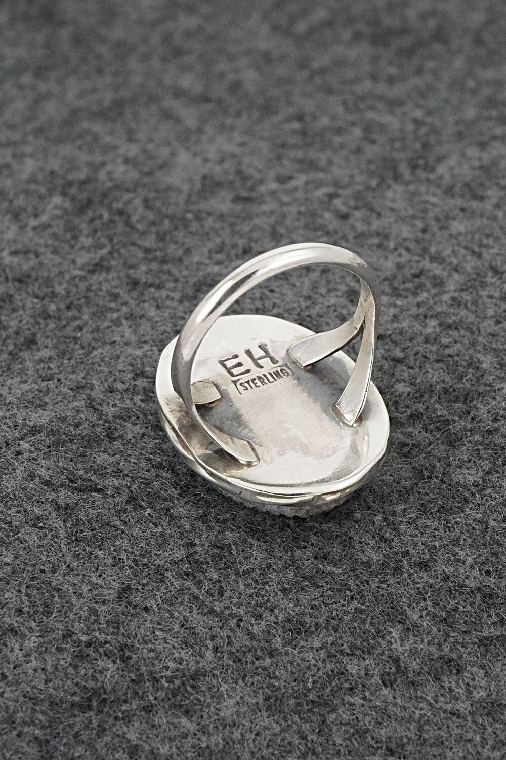 This Patagonia turquoise and sterling silver ring was made by Navajo silversmith Ernest Hawthorne. The back is stamped EH and sterling.