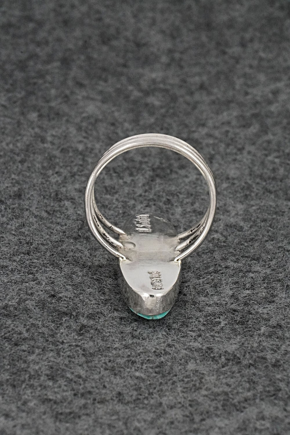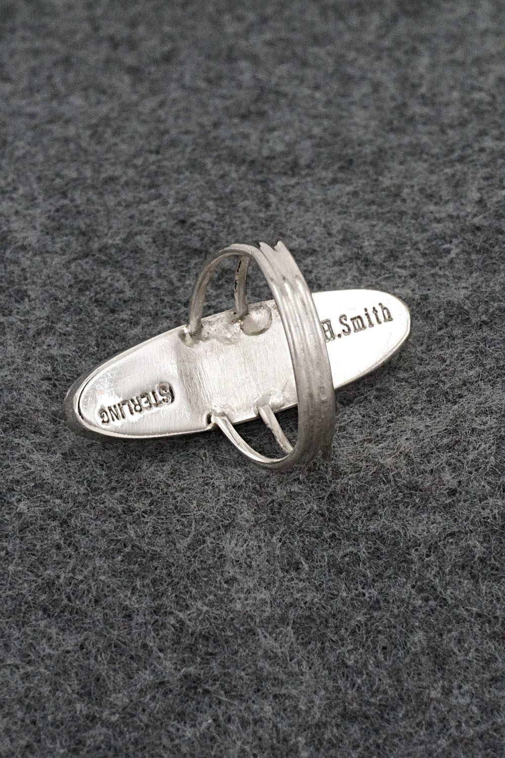 This beautiful turquoise inlay and sterling silver ring was made by Navajo silversmith Harold Smith. The back is stamped H. Smith and sterling.