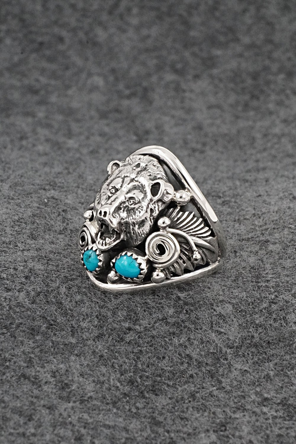 This impressive turquoise and bright-polish sterling silver ring featuring a bear and feathers was made by Navajo silversmith Jeanette Saunders. The back is signed and stamped sterling.