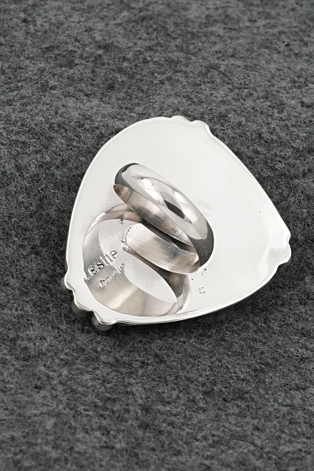 This beautiful turquoise and bright-polish sterling silver ring was made by Navajo silversmith Leslie Nez. The back is signed and stamped sterling.