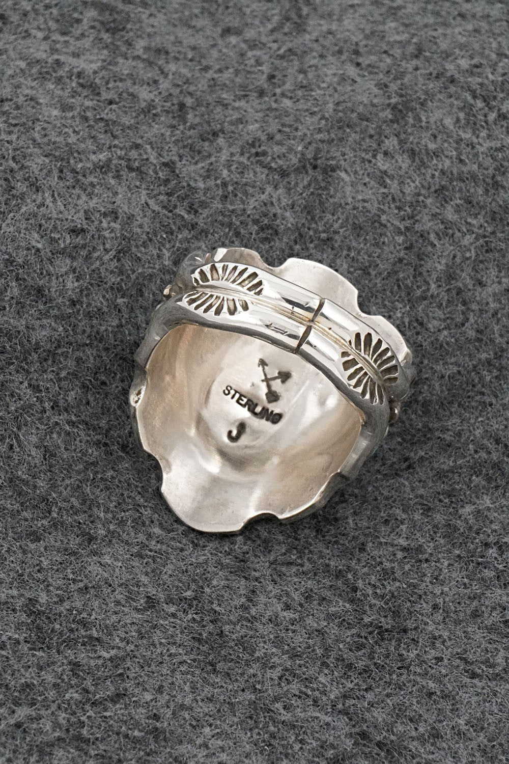 This impressive turquoise and sterling silver ring featuring a Native American face in profile was made by Navajo silversmith Melvin Jones. The back is stamped J and sterling.