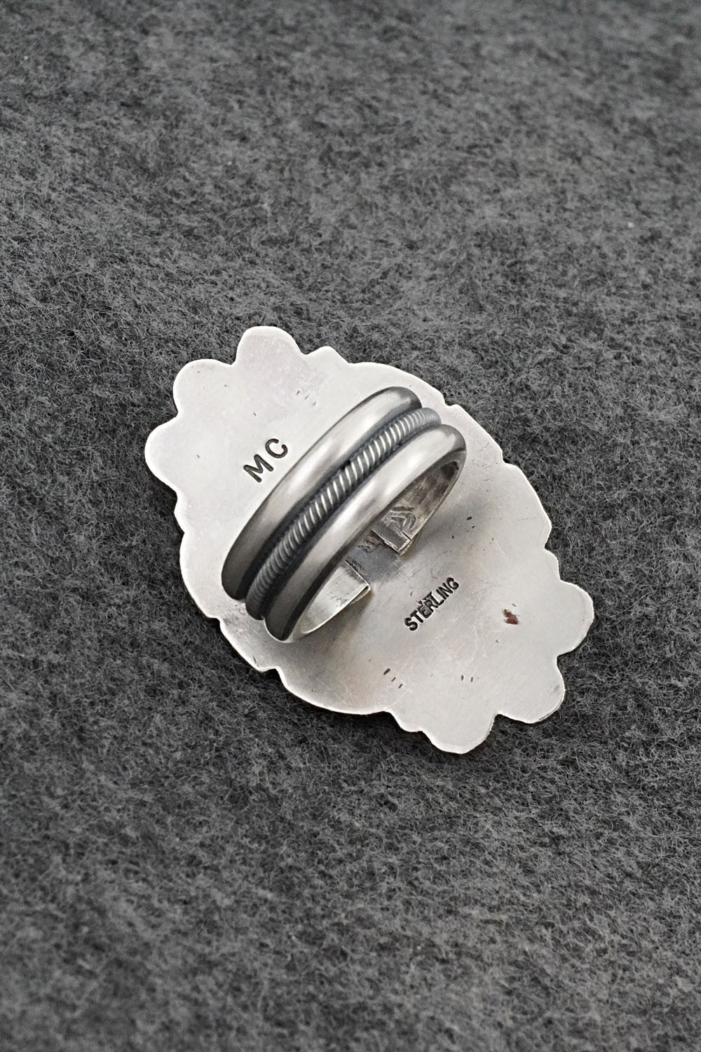 This beautiful turquoise and brushed-finish sterling silver ring was made by Navajo silversmith Michael Calladitto. The back is signed MC and stamped sterling.