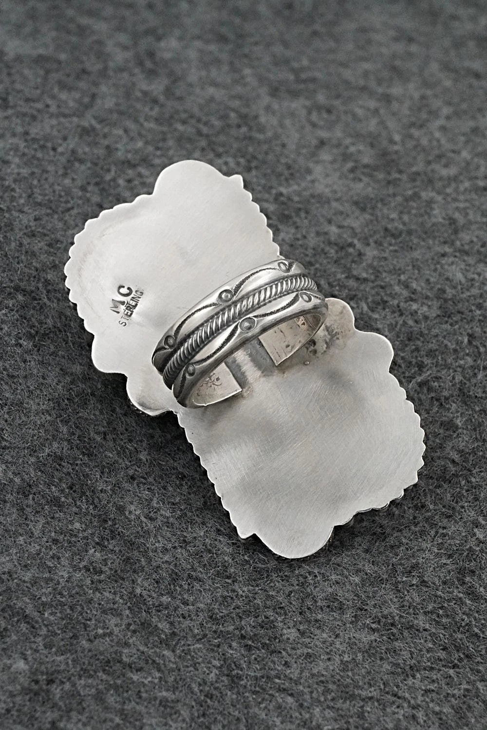 This impressive turquoise and brushed-finish sterling silver ring was made by Navajo silversmith Michael Calladitto. The back is stamped MC and sterling.