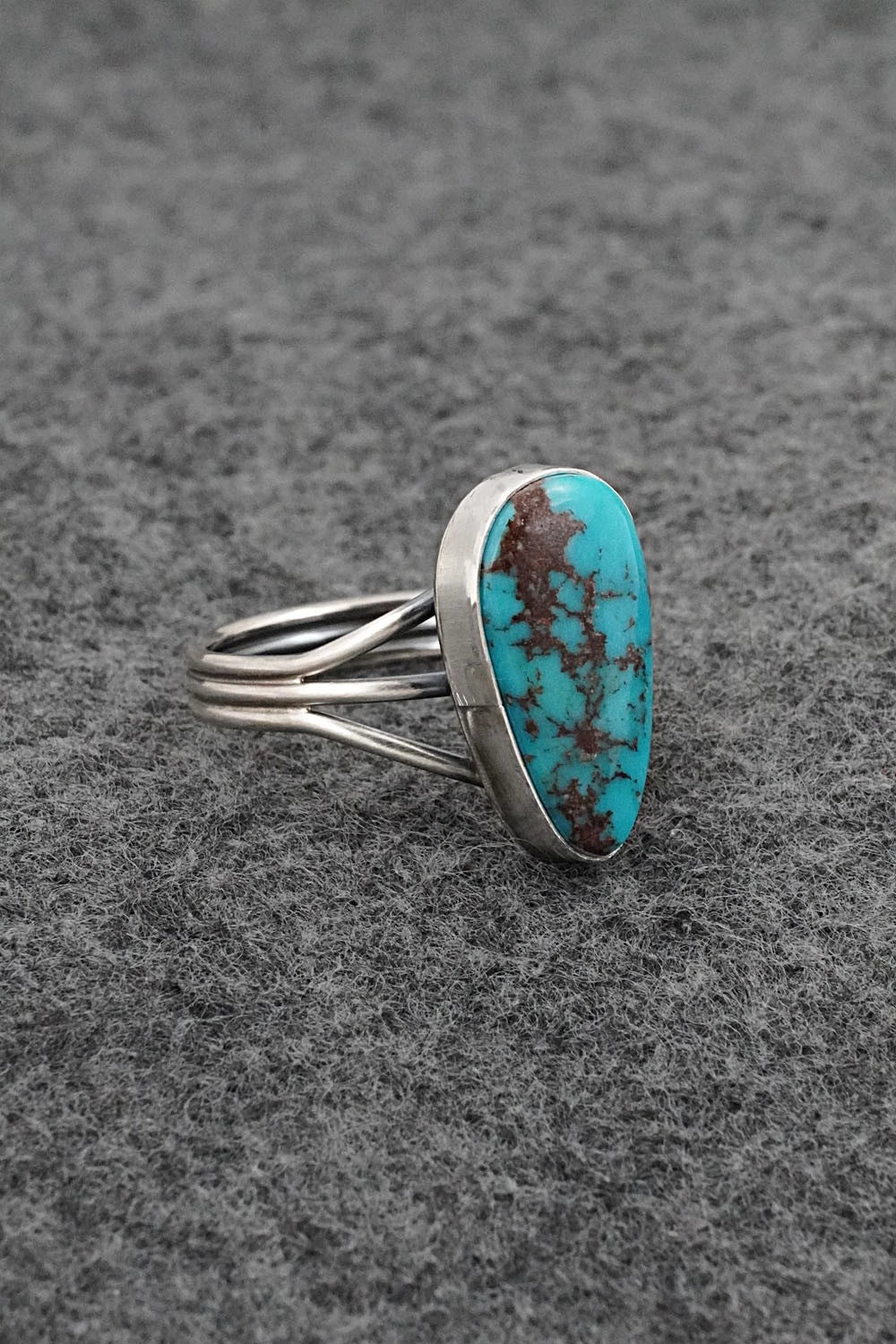 This Egyptian turquoise and brushed-finish sterling silver ring was made by Navajo silversmith Rena Begay. The back is signed R.Begay and stamped Sterling.