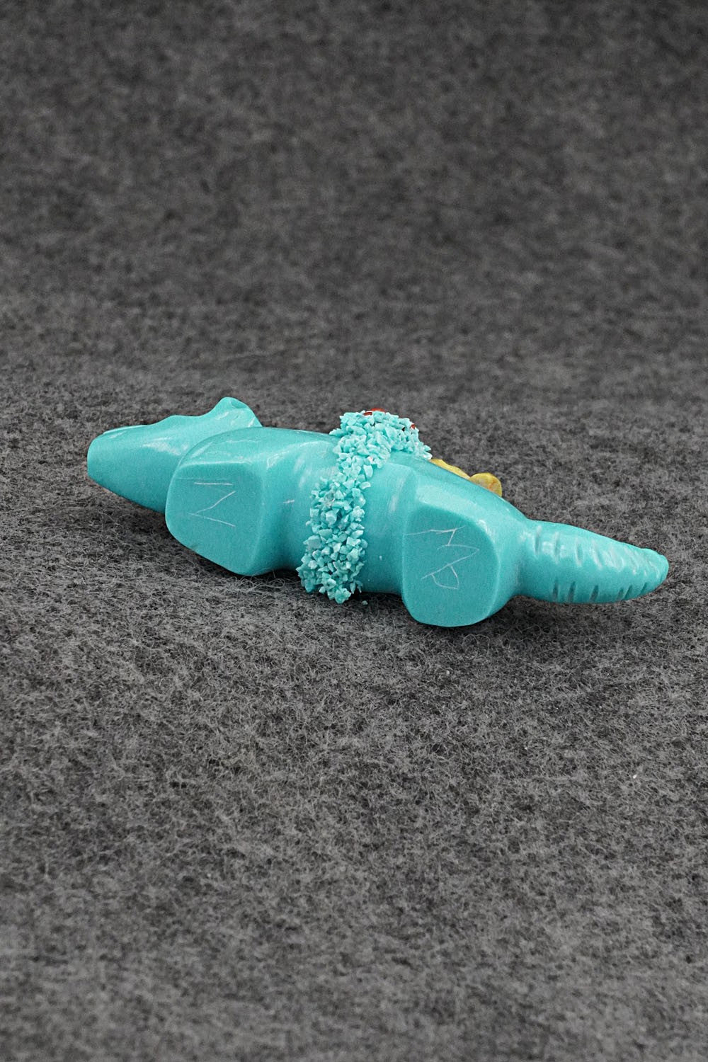 This wolf with arrowhead offering Zuni fetish was carved by Marvelita Phillips. The bottom is signed MP and Z.