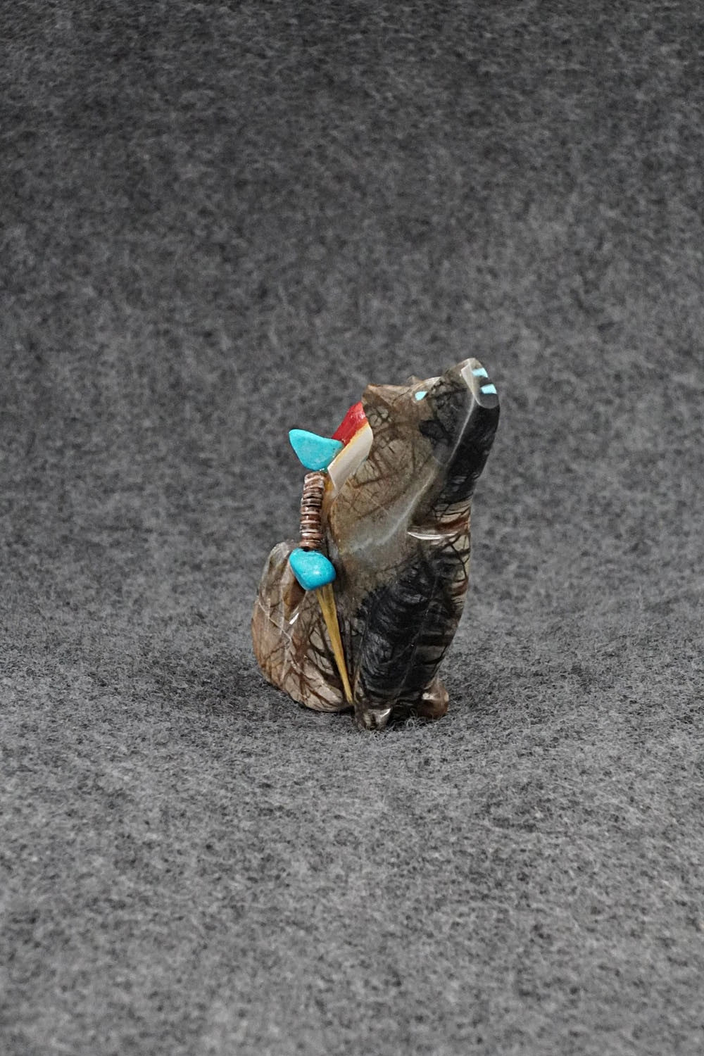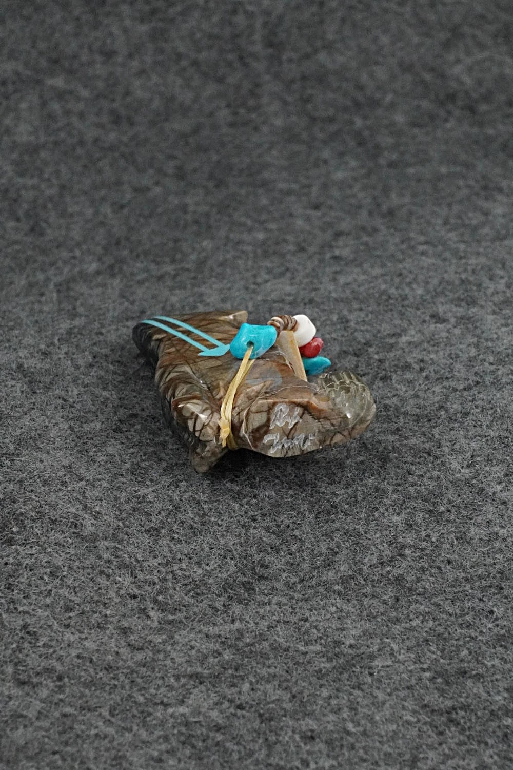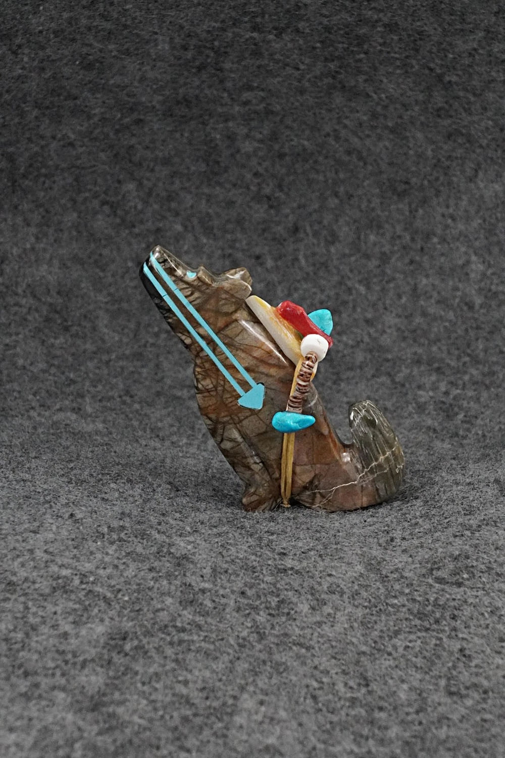 This wolf with arrow inlay design and arrowhead offering Zuni fetish was carved by Rodney Laiwakete. The bottom is signed Rodney Laiwakete.
